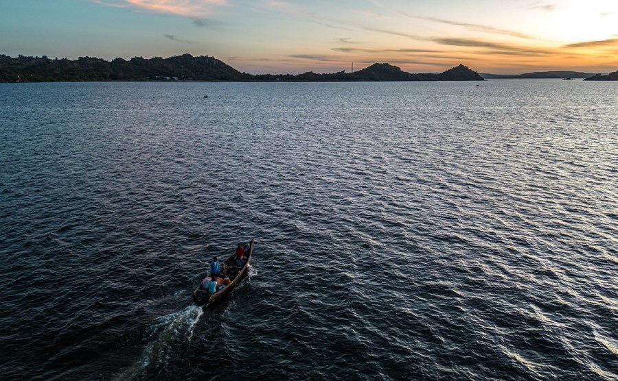 Photo prise le 11 juin 2023 montrant un bateau de pêche sur le lac Victoria dans la région de Mwanza, en Tanzanie. (Xinhua/Wang Guansen)
