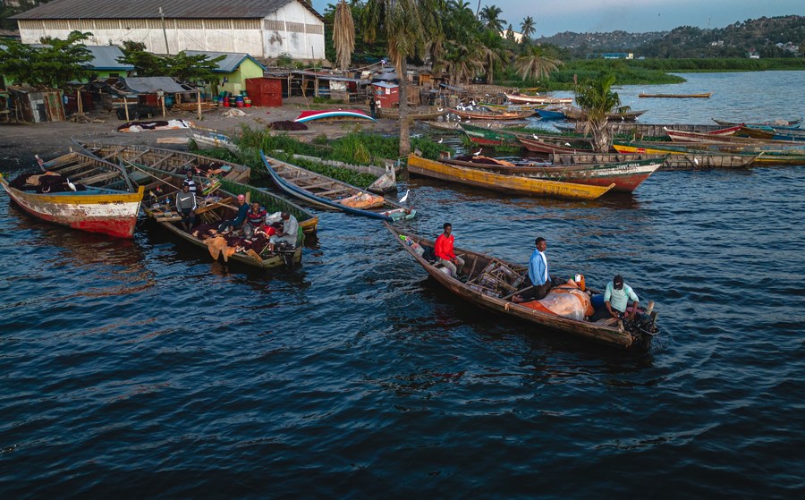 Photo prise le 11 juin 2023 montrant des bateaux de pêche sur le lac Victoria dans la région de Mwanza, en Tanzanie. (Xinhua/Wang Guansen)