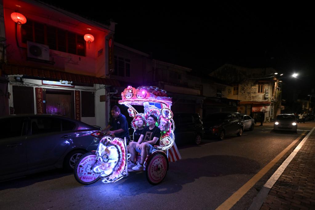 Des touristes prennent un pousse-pousse pour visiter la ville de Malacca, en Malaisie, le 18 juin 2023. (Xinhua/Cheng Yiheng)