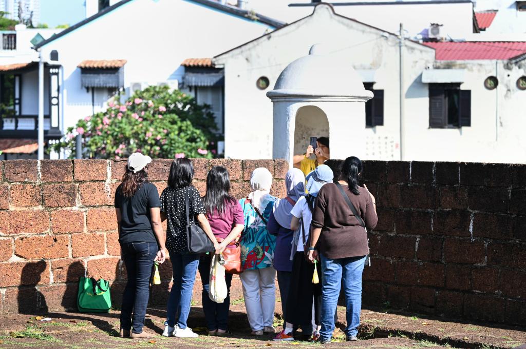 Des touristes posent pour une photo de groupe lors d'une visite des vestiges de l'ancien fort d'artillerie de Malacca, en Malaisie, le 18 juin 2023. (Xinhua/Cheng Yiheng)
