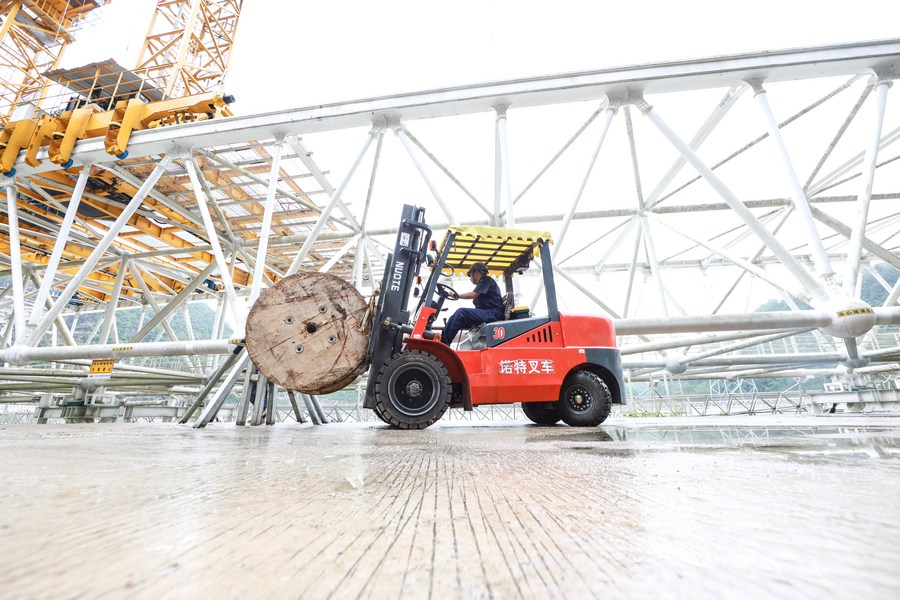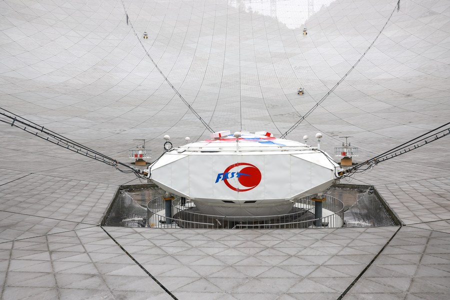 Un employé effectue une opération de maintenance régulière du radiotélescope sphérique de 500 mètres d'ouverture (Five-hundred-meter Aperture Spherical radio Telescope, FAST) dans la province chinoise du Guizhou (sud-ouest), le 22 juin 2023. (Photo : Ou Dongqu)