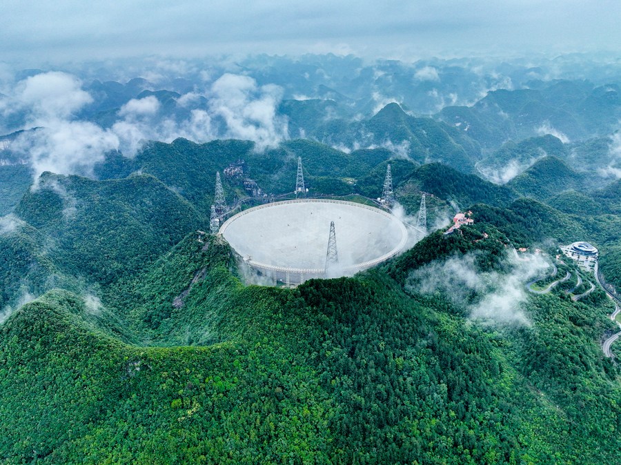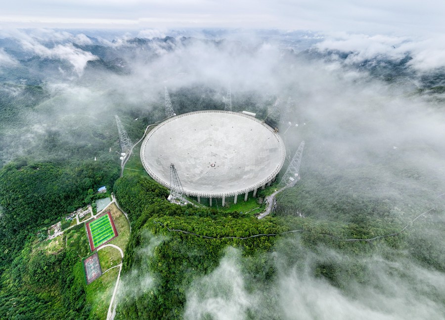 Le radiotélescope sphérique de 500 mètres d'ouverture (Five-hundred-meter Aperture Spherical radio Telescope, FAST) en maintenance dans la province chinoise du Guizhou (sud-ouest), le 22 juin 2023. (Photo : Ou Dongqu)