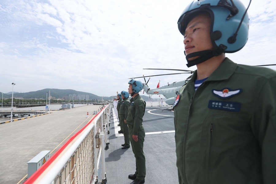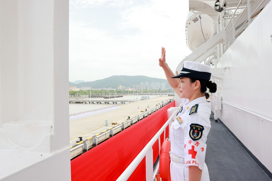 Des soldats font leurs adieux à bord du navire-hôpital chinois Arche de la paix (Peace Ark) dans un port de Zhoushan de la province chinoise du Zhejiang (est), le 3 juillet 2023. (Photo : Zhang Ling)