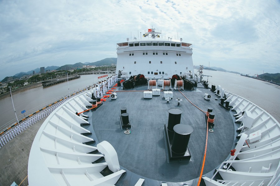 Le navire-hôpital chinois Arche de la paix (Peace Ark) se prepare à prendre la mer dans un port de Zhoushan de la province chinoise du Zhejiang (est), le 3 juillet 2023. (Photo : Gui Jiangbo)