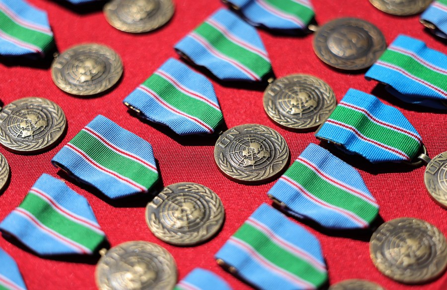 Photo montrant des médailles de la paix de l'ONU lors d'une cérémonie de remise de médailles dans le village de Hanniyah, dans le sud du Liban, le 1er juillet 2022. (Xinhua/Liu Zongya)