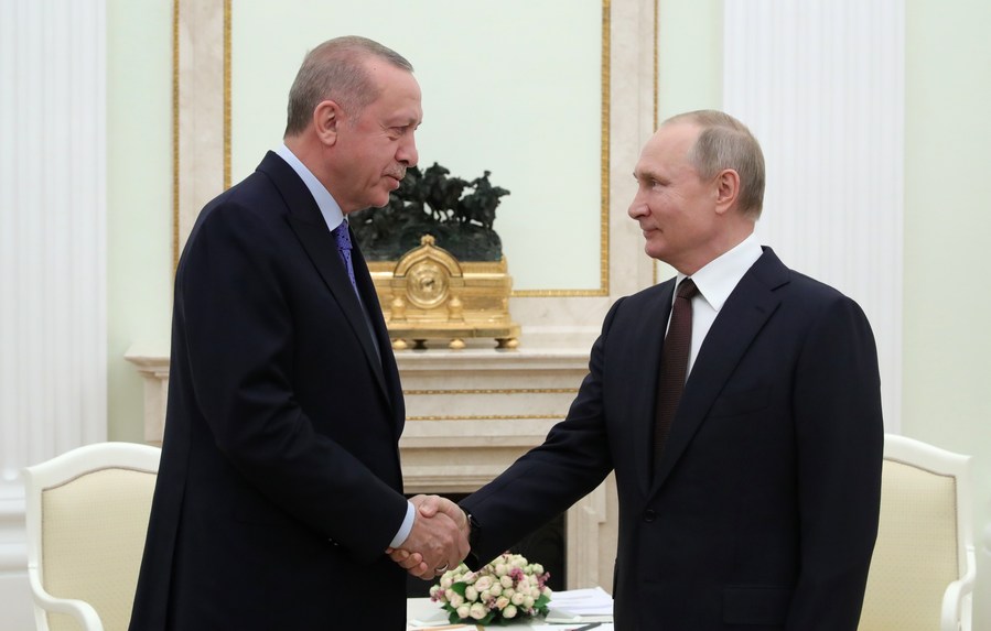 Rencontre entre le président russe Vladimir Poutine (à droite) et son homologue turc Recep Tayyip Erdogan à Moscou, la capitale russe, le 5 mars 2020. (Spoutnik/via Xinhua)