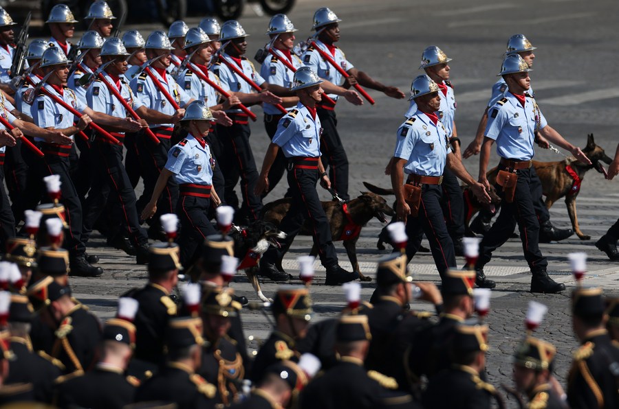 PARIS, 14 juillet (Xinhua) -- Le défilé militaire traditionnel du 14-Juillet sur la place de la Concorde à Paris, en France, le 14 juillet 2023. La France a organisé vendredi sa célébration annuelle de la Fête nationale avec un défilé militaire traditionnel. (Xinhua/Gao Jing)