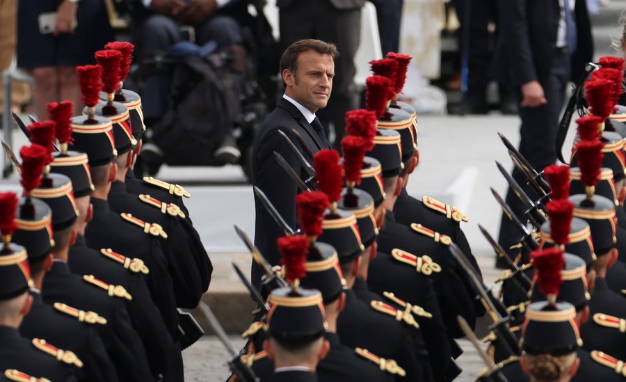 Le président français Emmanuel Macron assiste au défilé militaire traditionnel du 14-Juillet à Paris, en France, le 14 juillet 2023. (Xinhua/Gao Jing)