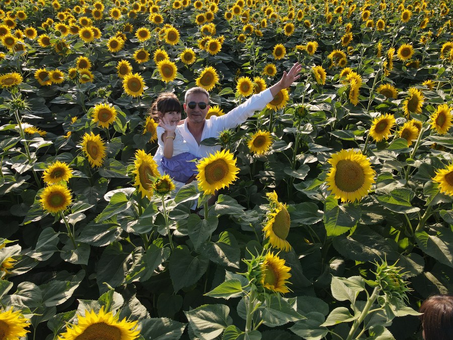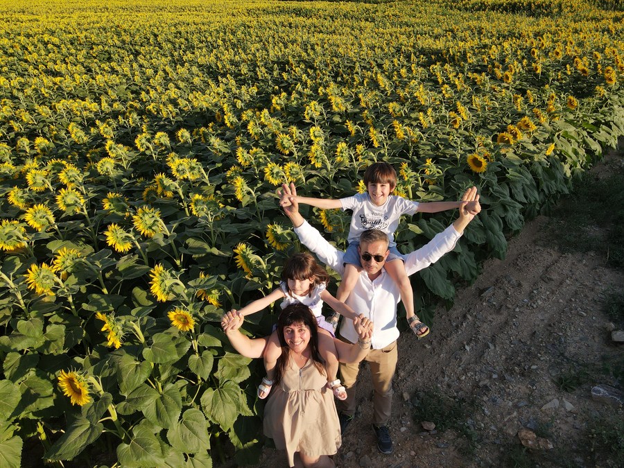 Photo aérienne prise le 15 juillet 2023 montrant quatre membres d'une famille en train de s'amuser dans un champ de tournesols dans la province d'Ankara, en Turquie.