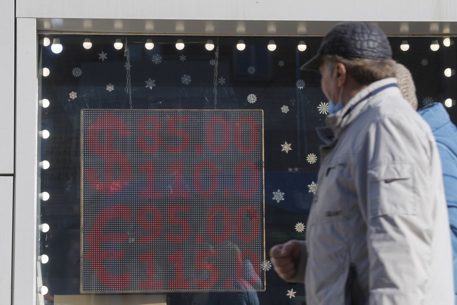 Des personnes passent devant l'écran d'un bureau de change affichant les taux de change du dollar et de l'euro en roubles russes à Moscou, en Russie, le 1er mars 2022. (Xinhua/Alexandre Zemlianichenko Jr)