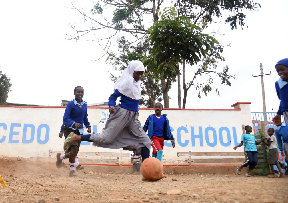 NAIROBI, 28 juillet (Xinhua) -- Des élèves de l'école Mcedo Beijing jouent au football dans le quartier de Mathare à Nairobi, au Kenya, le 28 juillet 2023. (Xinhua/John Okoyo)