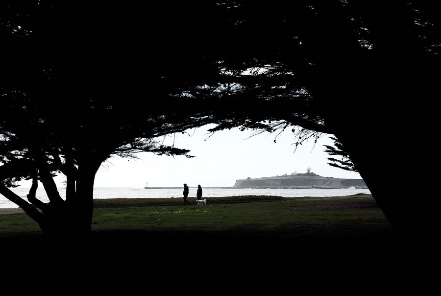 Des gens se baladent au bord de la mer à Half Moon Bay en Californie, aux Etats-Unis, le 5 mars 2021. (Xinhua/Wu Xiaoling)
