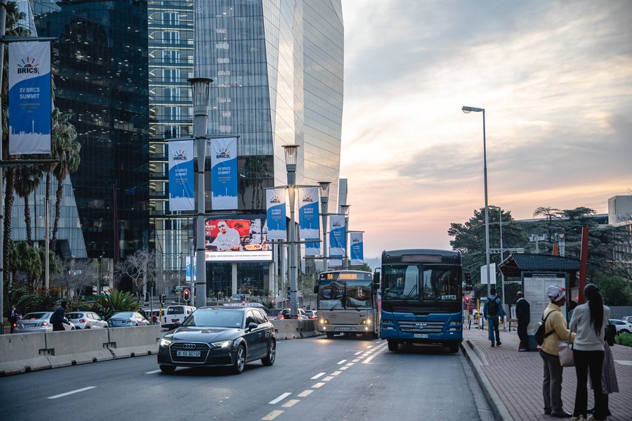 Photo prise le 17 août 2023 d'une rue de Johannesburg, en Afrique du Sud, en amont du 15e sommet des BRICS. (Xinhua/Wang Guansen)