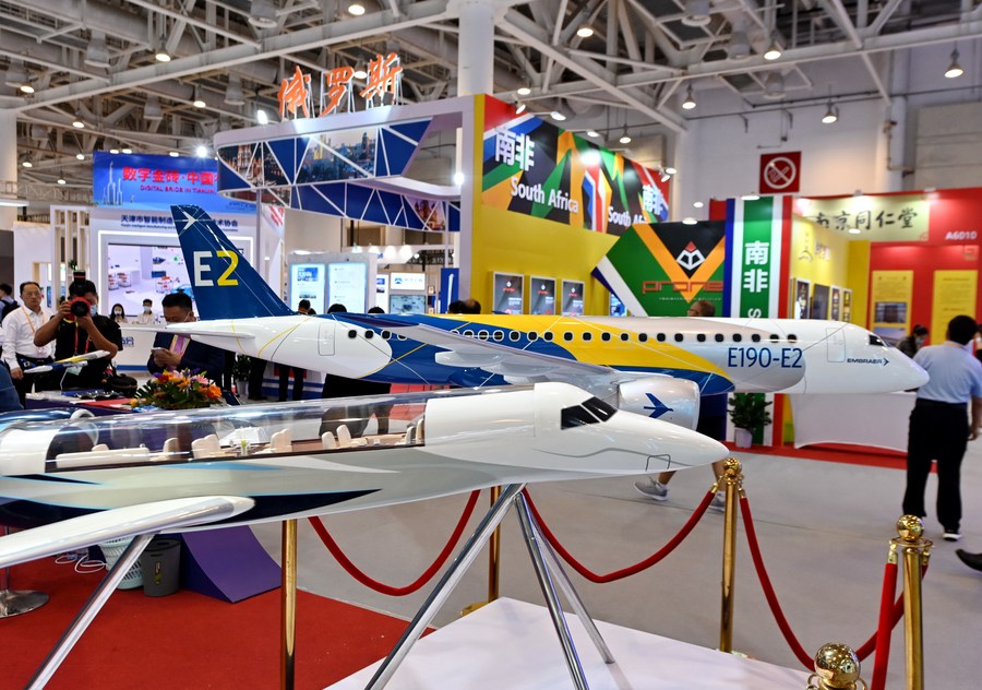 Photo prise le 8 septembre 2021 montrant des modèles de jets lors d'une exposition sur la nouvelle révolution industrielle des BRICS qui s'est tenue à Xiamen dans la province du Fujian, dans l'est de la Chine. (Xinhua/Lin Shanchuan)