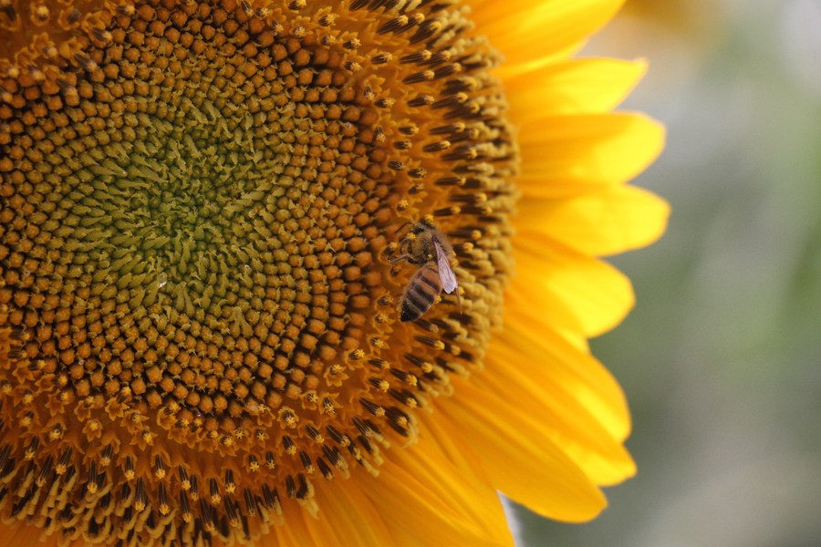 Photo prise le 6 août 2023 montrant une abeille en train de butiner un tournesol dans la province de Balkh, en Afghanistan. (Xinhua/Khibar Momand)