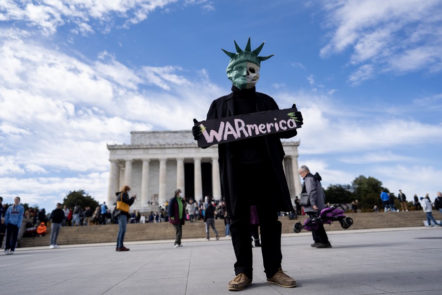 Un manifestant brandit un slogan lors d'un rassemblement anti-guerre à Washington, D.C., aux Etats-Unis, le 19 février 2023. (Xinhua/Liu Jie)