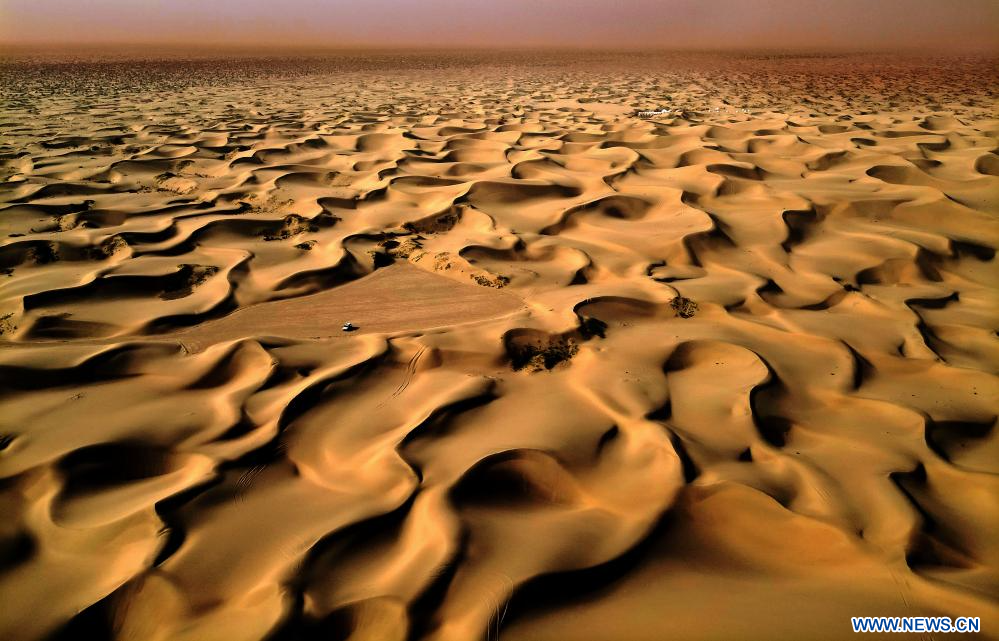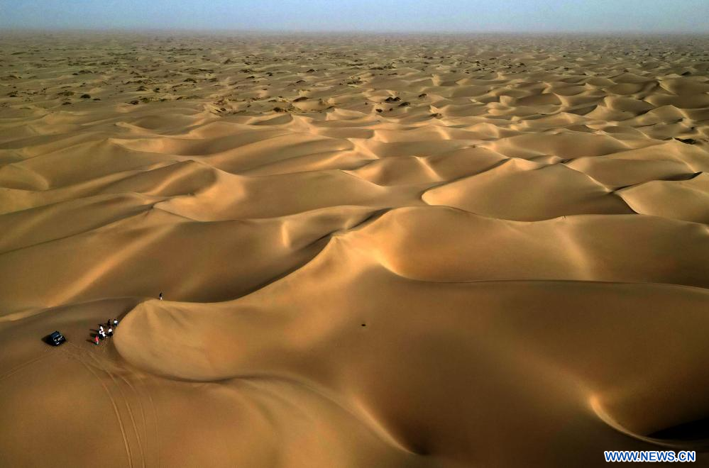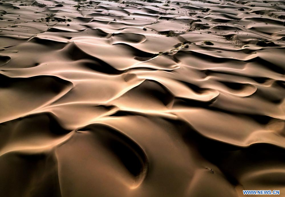 KACHGAR, 9 septembre (Xinhua) -- Photo aérienne d'un paysage de désert dans le district de Makit à Kachgar, dans la région autonome ouïgoure du Xinjiang (nord-ouest de la Chine), le 7 septembre 2023. Le district de Makit, situé sur le bord sud-ouest du désert de Taklamakan, a profité de ses ressources naturelles pour développer le tourisme et créer des emplois pour la population locale. (Photo : Li An)