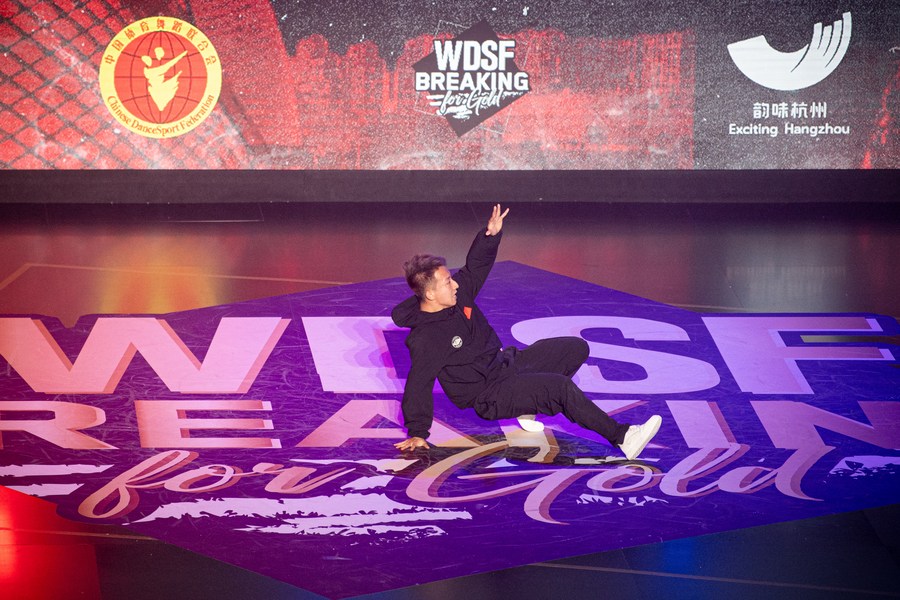 Le Chinois Shang Xiaoyu (X-Rain) lors de l'épreuve B-Boy du Championnat d'Asie WDSF de Breaking 2023 à Hangzhou, dans la province chinoise du Zhejiang (est), le 2 juillet 2023. (Photo : Jiang Han)