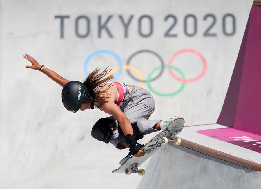 La Britannique Sky Brown lors de la finale de l'épreuve "park" aux Jeux olympiques de Tokyo 2020 à Tokyo, au Japon, le 4 août 2021. (Photo : Li Ga)