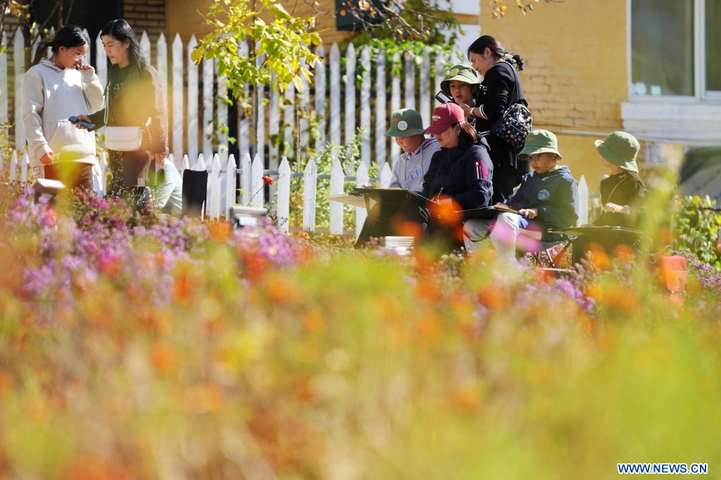 BEIJING, 3 octobre (Xinhua) -- Des étudiants peignent sur le vif dans le bourg de Hengdaohezi à Hailin, dans la province chinoise du Heilongjiang (nord-est), le 2 octobre 2023. Les habitants de tout le pays participent à des activités culturelles pendant les congés de la Fête nationale. (Photo : Wang Jianwei)