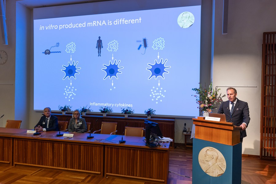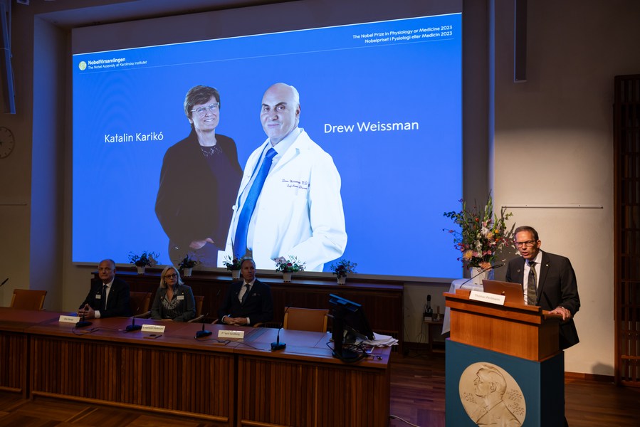 L'annonce du prix Nobel de physiologie ou de médecine 2023 a lieu à l'Institut Karolinska à Stockholm, en Suède, le 2 octobre 2023. (Xinhua/Wei Xuechao)■