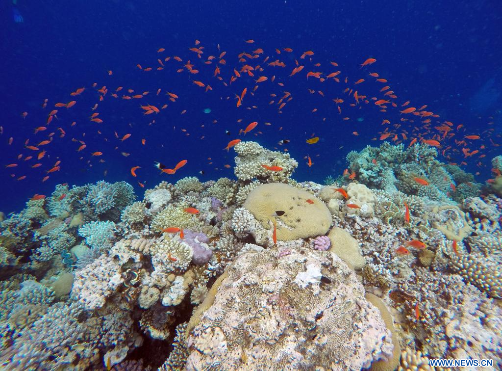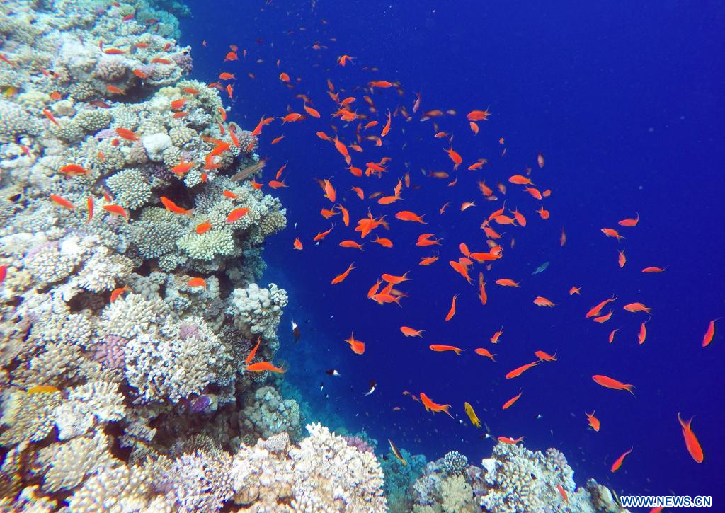 DAHAB (Egypte), 3 octobre (Xinhua) -- Des poissons nagent autour de coraux dans le Blue Hole à Dahab, en Egypte, le 2 octobre 2023. Dahab, ville située sur la côte sud-est de la péninsule du Sinaï en Egypte, est mondialement connue pour ses nombreux sites de plongée, dont le Blue Hole (trou bleu). (Xinhua/Sui Xiankai)