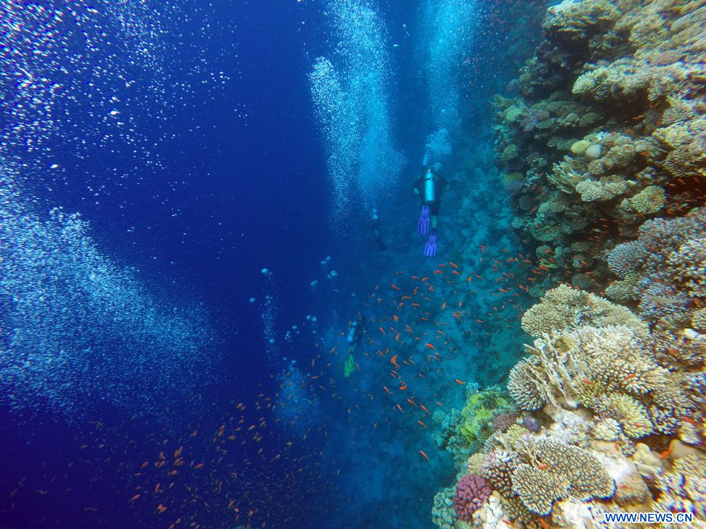 DAHAB (Egypte), 3 octobre (Xinhua) -- Des plongeurs devant des coraux dans le Blue Hole à Dahab, en Egypte, le 2 octobre 2023. Dahab, ville située sur la côte sud-est de la péninsule du Sinaï en Egypte, est mondialement connue pour ses nombreux sites de plongée, dont le Blue Hole (trou bleu). (Xinhua/Sui Xiankai)