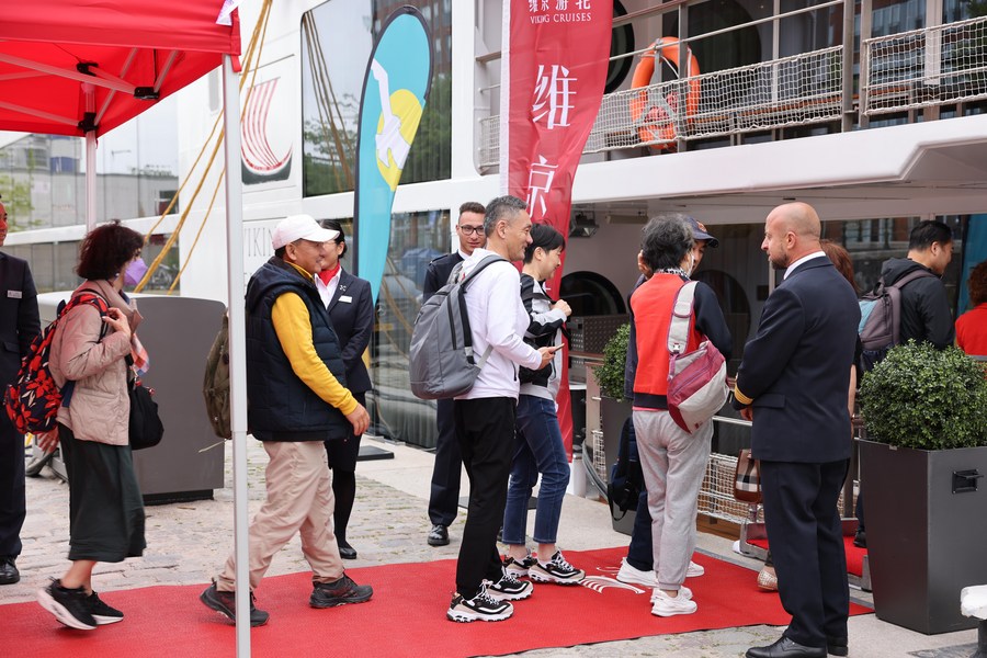 Des touristes chinois montent à bord du bateau de croisière Viking Eistla à Amsterdam, aux Pays-Bas, le 1er juin 2023. (Viking Cruises/via Xinhua)