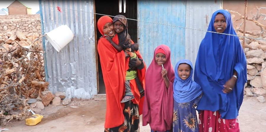 Photo prise le 23 décembre 2022 montrant la Somalienne Haawo Mohamud Farah (première à gauche), conductrice de tuk-tuk, tricycle motorisé qui fait office de taxi, et des membres de sa famille dans la ville d'Adado, en Somalie. (Xinhua/Adbi)