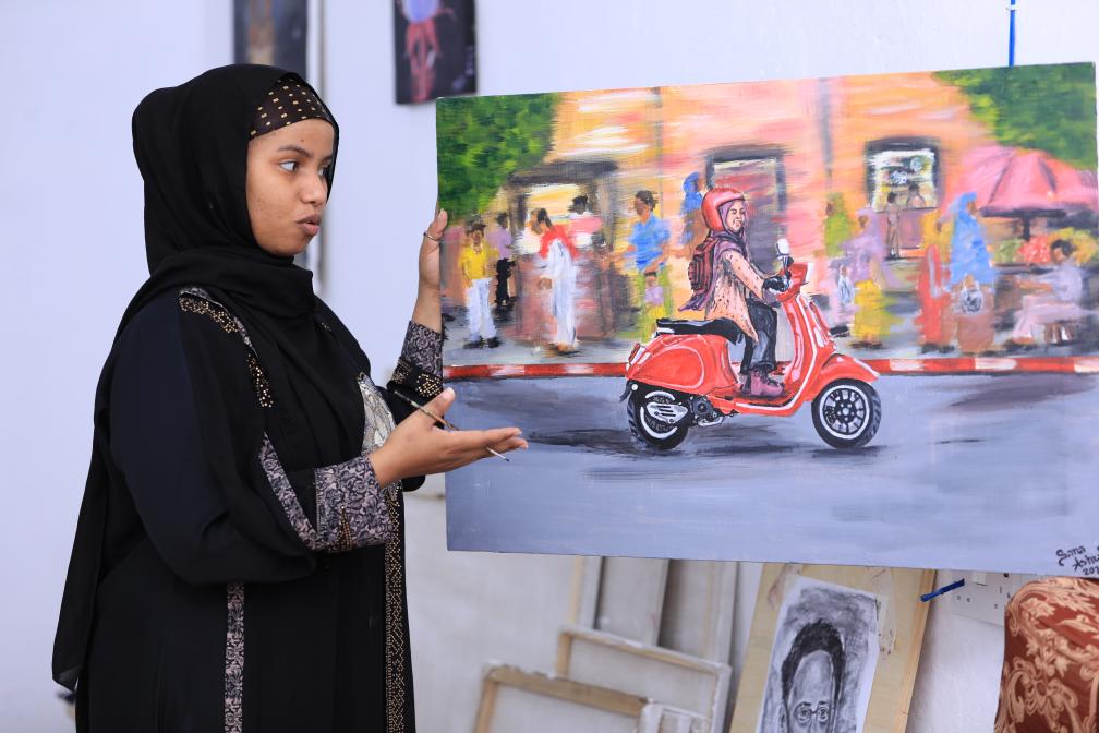 Sana Ashraf Sharif, une artiste, présente un tableau qu'elle a peint dans le quartier de Manabolyo à Mogadiscio, capitale de la Somalie. (Xinhua/Hassan Bashi)
