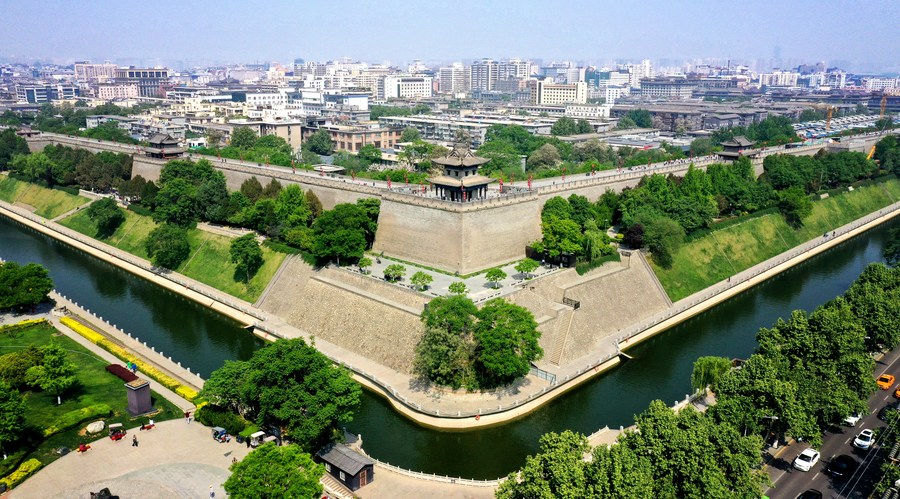 Photo aérienne prise le 19 avril 2023 montrant le coin sud-est de l'ancien mur de la ville de Xi'an, de la province du Shaanxi, dans le nord-ouest de la Chine. (Photo : Liu Xiao)