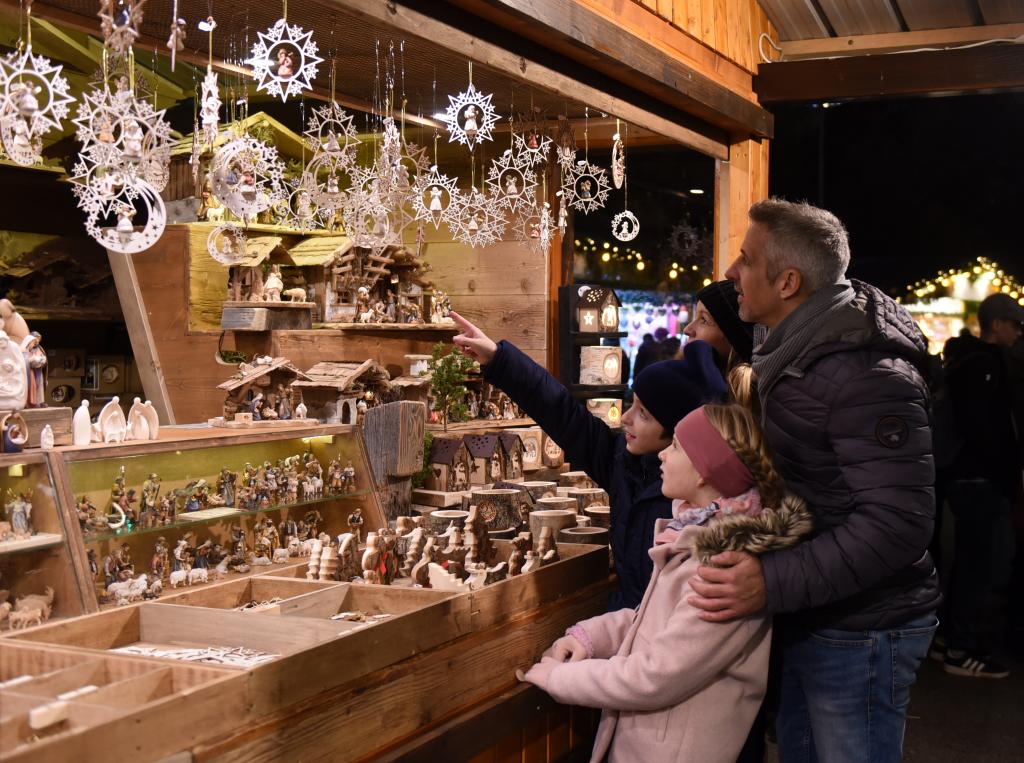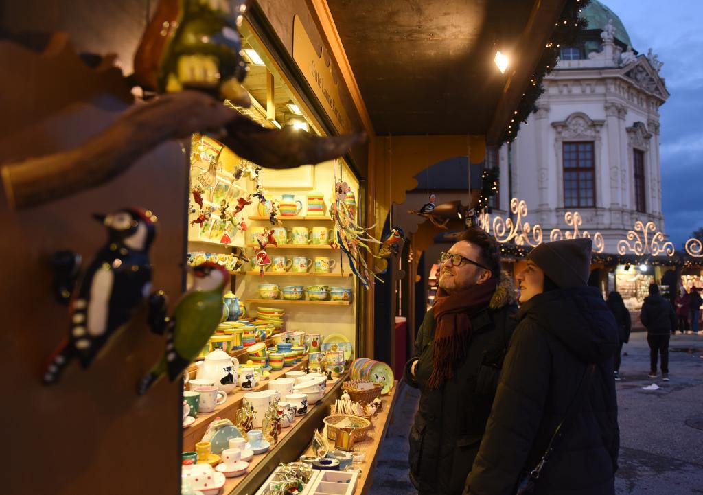 Des gens choisissent des décorations de Noël sur le marché de Noël du Belvédère à Vienne, en Autriche, le 17 novembre 2023. (Xinhua/Han Lu)