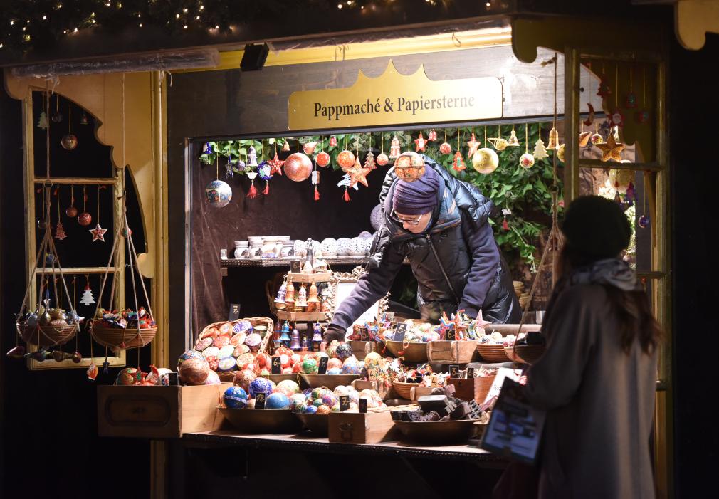 Photo prise le 17 novembre 2023 montrant un vendeur qui arrange des décorations de Noël au marché de Noël du Belvédère, à Vienne, en Autriche. (Xinhua/Han Lu)
