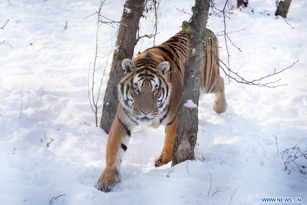 HARBIN, 20 novembre (Xinhua) -- Des tigres de Sibérie dans la neige au parc des tigres de Sibérie à Harbin, dans la province chinoise du Heilongjiang (nord-est), le 17 novembre 2023. (Photo : Wang Jianwei)
