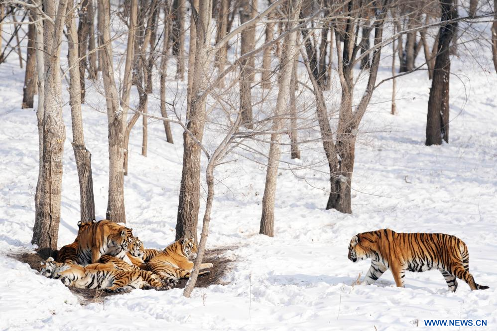 HARBIN, 20 novembre (Xinhua) -- Des tigres de Sibérie se blottissent dans la neige au parc des tigres de Sibérie à Harbin, dans la province chinoise du Heilongjiang (nord-est), le 17 novembre 2023. (Photo : Wang Jianwei)