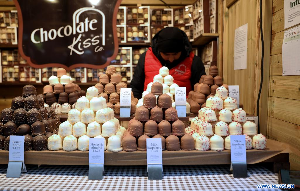 LONDRES, 3 décembre (Xinhua) -- Un commerçant vend du chocolat sur le marché de Noël de Trafalgar Square à Londres, au Royaume-Uni, le 2 décembre 2023. (Xinhua/Li Ying)