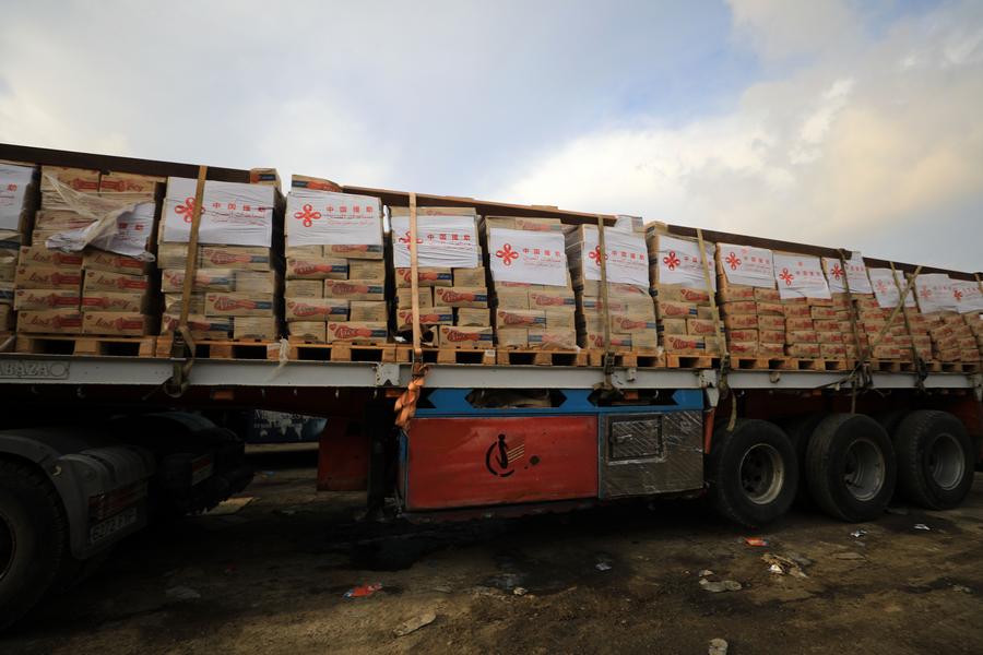 GAZA, 18 décembre (Xinhua) -- Un camion transportant de l'aide humanitaire offerte par la Chine se trouve du côté de Gaza du poste-frontière de Kerem Shalom, à la frontière entre Israël et la bande de Gaza, le 17 décembre 2023. (Xinhua/Yasser Qudih)