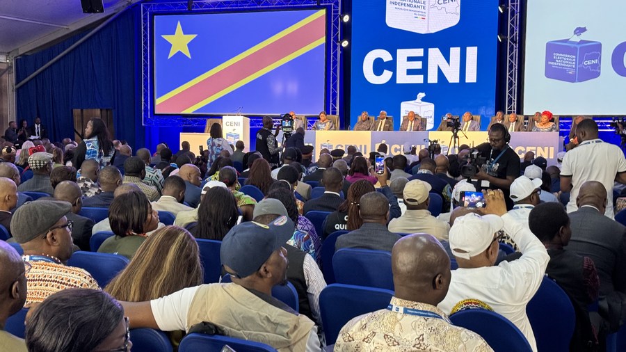 Photo prise le 31 décembre 2023 à Kinshasa, la capitale de la République démocratique du Congo (RDC), lors d'une réunion organisée par la Commission électorale nationale indépendante (CENI) pour annoncer les résultats préliminaires de l'élection présidentielle. (Xinhua/Alain Uyakani)