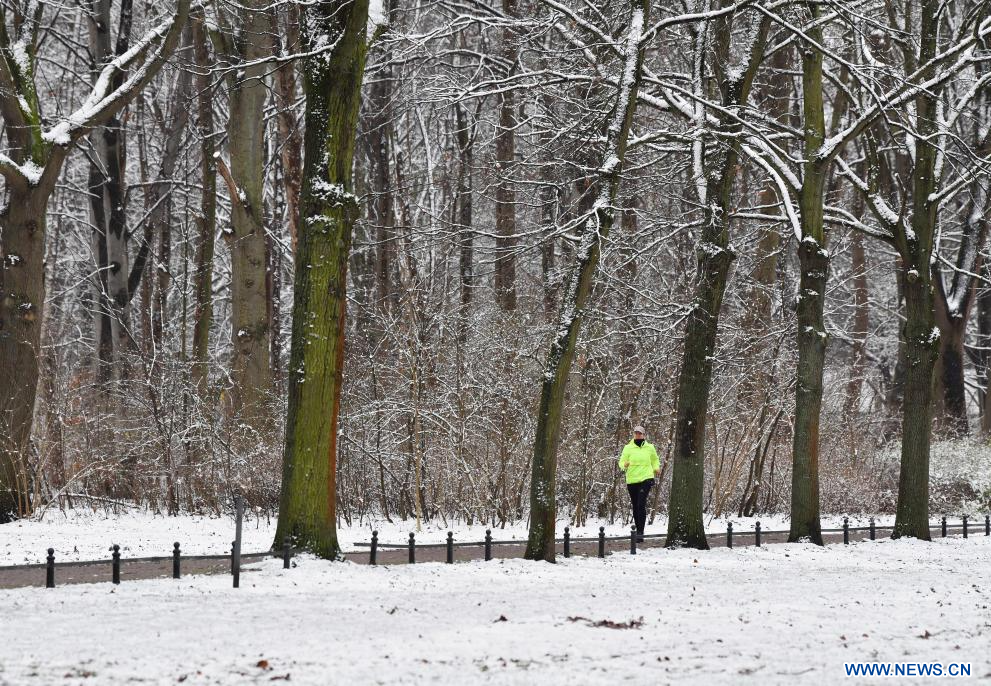 BERLIN, 5 janvier (Xinhua) -- Une femme court dans le parc Tiergarten à Berlin, en Allemagne, le 5 janvier 2024. (Xinhua/Ren Pengfei)