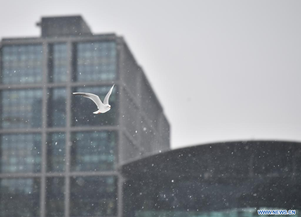 BERLIN, 5 janvier (Xinhua) -- Un mouette rieuse vole sous la neige tombante à Berlin, en Allemagne, le 5 janvier 2024. (Xinhua/Ren Pengfei)