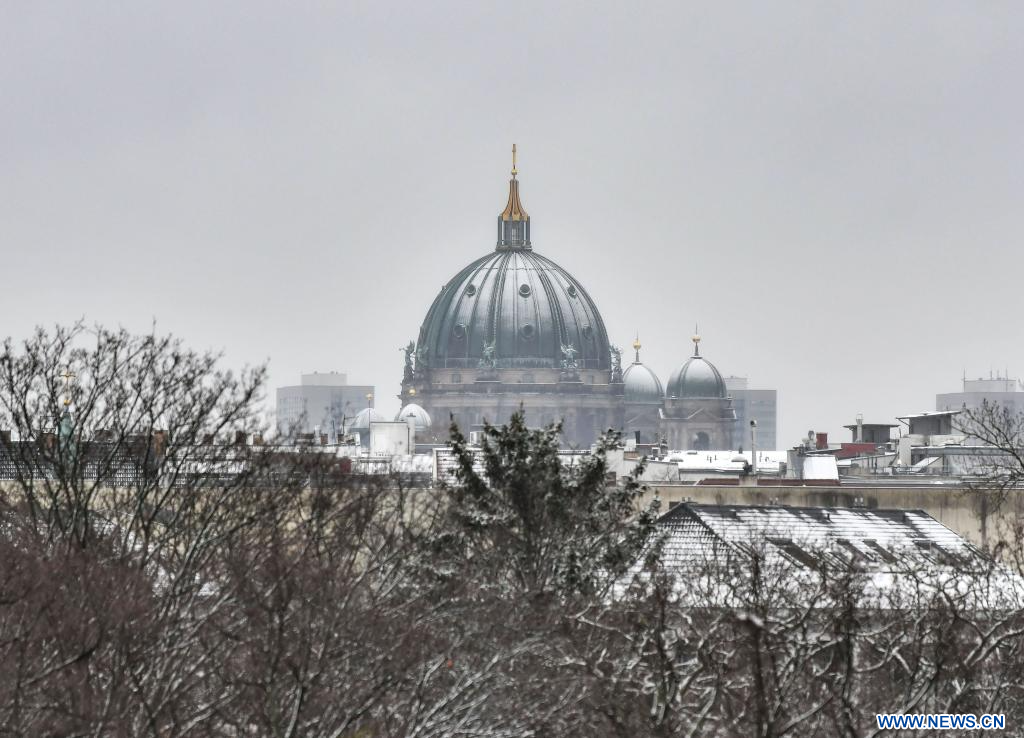 BERLIN, 5 janvier (Xinhua) -- Photo prise le 5 janvier 2024 montrant les dômes de la cathédrale de Berlin couverts de neige à Berlin, en Allemagne. (Xinhua/Ren Pengfei)