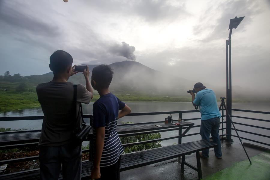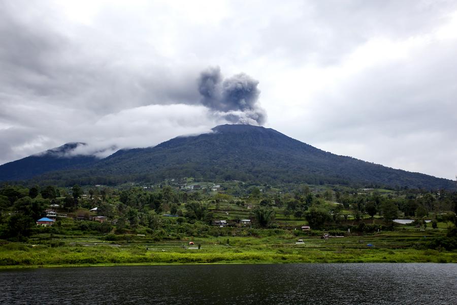 SUMATRA OCCIDENTAL, 7 janvier (Xinhua) -- Des personnes regardent une éruption volcanique au cours de laquelle des matériaux volcaniques s'échappent du mont Marapi, dans le district de Tanah Datar à Sumatra occidental, en Indonésie, le 7 janvier 2024. (Xinhua/Andri Mardiansyah)
