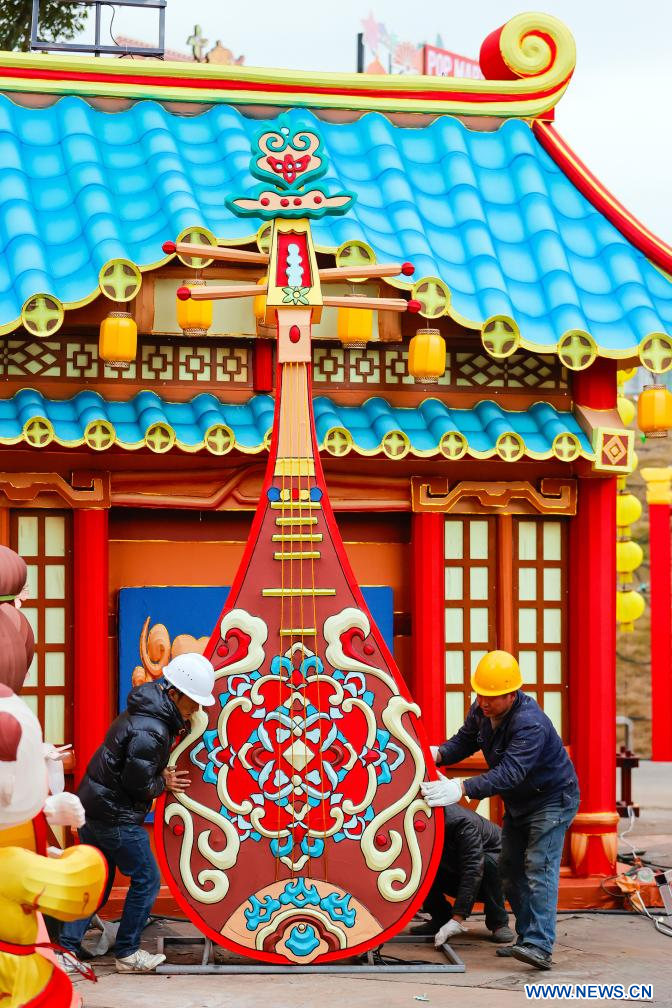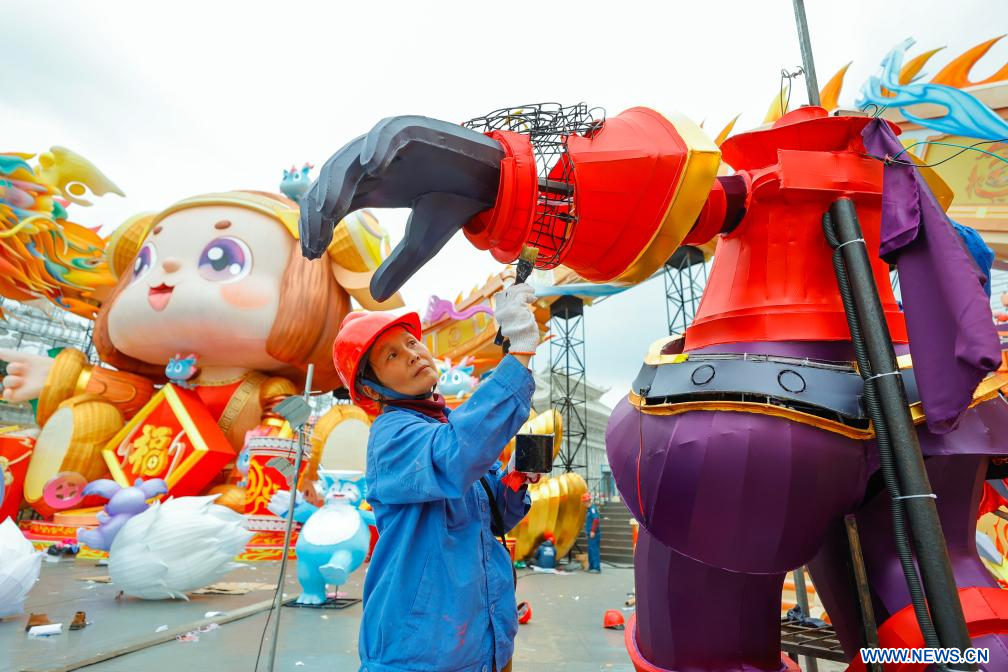 Des employés installent une lanterne colorée sur le site du prochain festival des lanternes à Zigong, dans la province chinoise du Sichuan (sud-ouest), le 18 janvier 2024. Le 30e Festival international des lanternes-dinosaures débutera ici le 2 février. (Photo : Shen Bohan)
