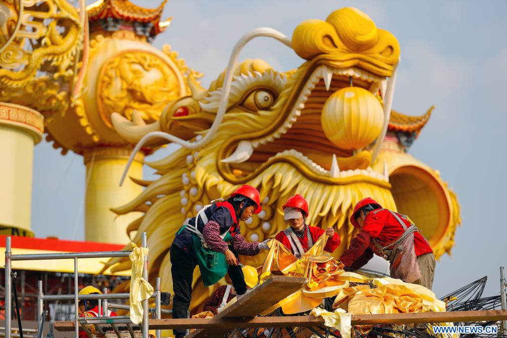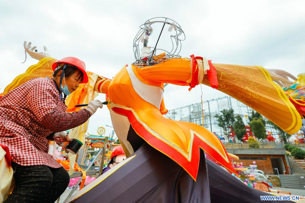 Des employées confectionnent une lanterne colorée sur le site du prochain festival des lanternes à Zigong, dans la province chinoise du Sichuan (sud-ouest), le 18 janvier 2024. Le 30e Festival international des lanternes-dinosaures débutera ici le 2 février. (Photo : Shen Bohan)