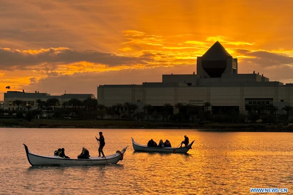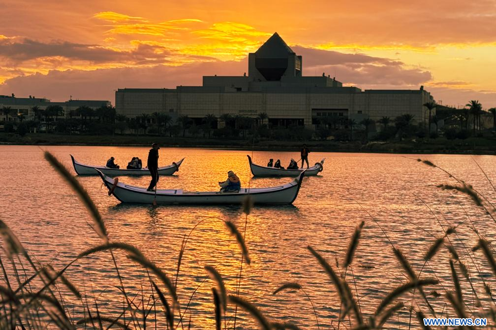 LE CAIRE, 8 février (Xinhua) -- Des gens profitent du coucher du soleil en prenant des bateaux sur un lac devant le Musée national de la civilisation égyptienne au Caire, en Egypte, le 7 février 2024. (Xinhua/Ahmed Gomaa)