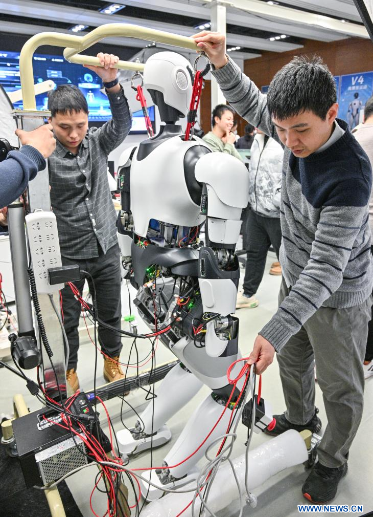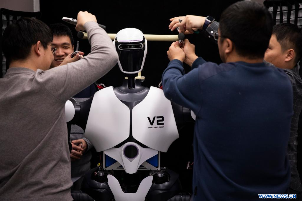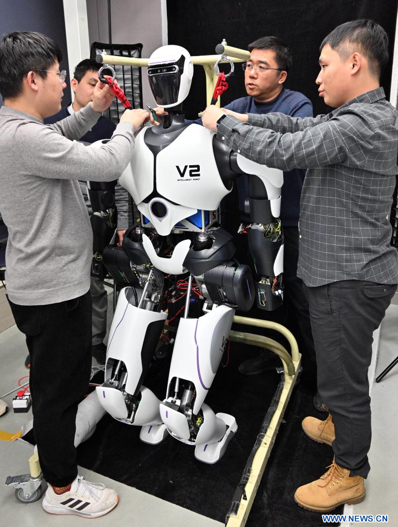 BEIJING, 8 février (Xinhua) -- Des chercheurs ajustent un robot humanoïde dans un laboratoire d'intelligence artificielle le 31 janvier 2024. Les robots humanoïdes de la "famille Q" développés par l'équipe de recherche de l'Institut d'automatisation de l'Académie des sciences de Chine, ont récemment fait leurs débuts en public à Beijing. (Photo : Chen Yehua)