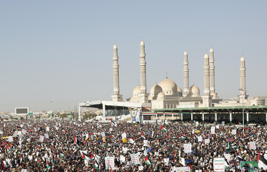 Photo prise le 12 janvier 2024 d'un rassemblement à Sanaa, au Yémen. (Xinhua/Mohammed Mohammed)
