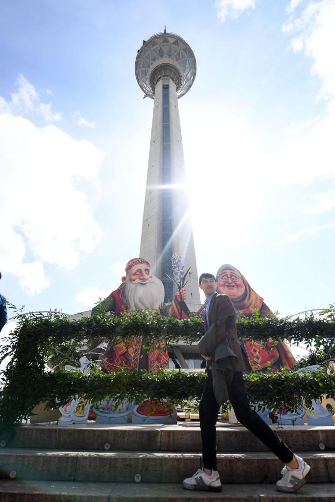 TEHERAN, 21 mars (Xinhua) -- Des gens célèbrent Norouz, ou le Nouvel An persan, à Téhéran, en Iran, le 20 mars 2024. (Xinhua/Shadati)Un homme passe devant la Tour Milad avec des décorations célébrant Norouz, ou le Nouvel An persan, à Téhéran, en Iran, le 20 mars 2024. (Xinhua/Shadati)