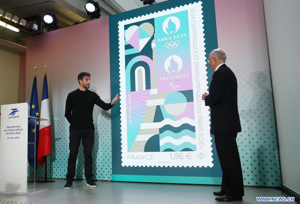 PARIS, 27 mars (Xinhua) -- Le timbre officiel des Jeux Olympiques et Paralympiques de Paris, en collaboration entre le Comité d'organisation de Paris 2024 et le groupe La Poste, a été officiellement dévoilé mardi au Musée français de la Poste.