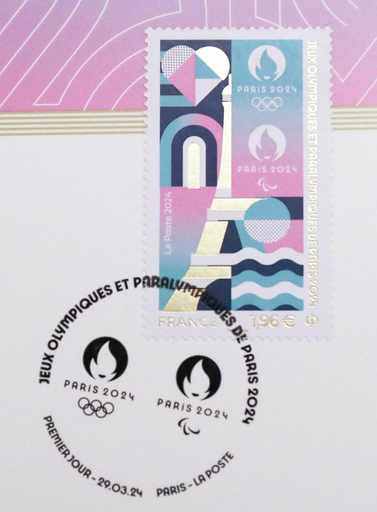PARIS, 27 mars (Xinhua) -- Un timbre officiel des Jeux Olympiques et Paralympiques de Paris 2024 est présenté au Musée de la Poste à Paris, France, le 26 mars 2024. S'inspirant de l'identité visuelle des JO de Paris, le timbre met en valeur des lieux emblématiques comme la Tour Eiffel et la Seine, avec des éléments sportifs tels que des pistes d'athlétisme et des rebonds de balle. (Xinhua/Gao Jing)Photo prise le 26 mars 2024 montrant des timbres officiels des Jeux Olympiques et Paralympiques de Paris 2024. (Xinhua/Gao Jing)Le président du Comité d'organisation de Paris 2024 Tony Estanguet (à gauche), la ministre française des Sports Amélie Oudéa-Castéra (au centre) et le directeur général de La Poste Philippe Wahl posent avec des timbres officiels des Jeux Olympiques et Paralympiques de Paris 2024 lors d'une présentation au Musée de La Poste à Paris, France, le 26 mars 2024. (Xinhua/Gao Jing)